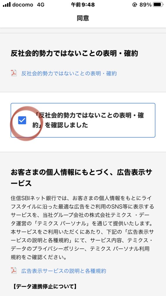 ステップ7 ”画面を下にスクロールし「反社会勢力ではないことの表明・確約」を確認しました”にチェックして一番下の「同意する」をタップ