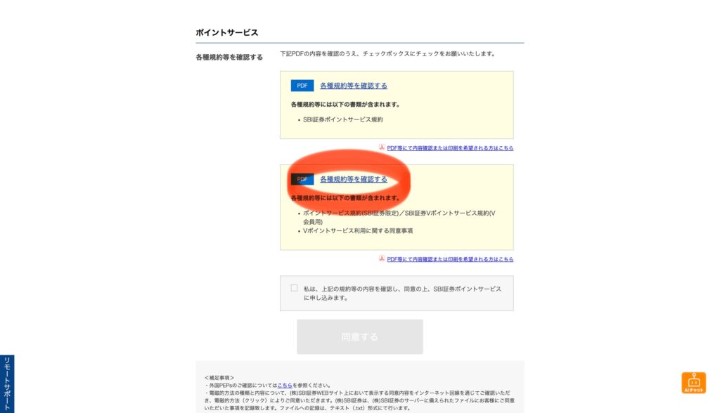 ステップ20”PDF・ポイントサービス規約(SBI証券限定)/SBI証券Vポイントサービス規約(V会員用)・Vポイントサービス利用に関する同意事項”をクリックする。