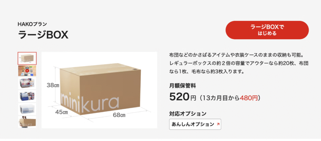 【一番リーズナブルなHAKOプラン】のラージBOX1箱に家財を69個入れ預けました