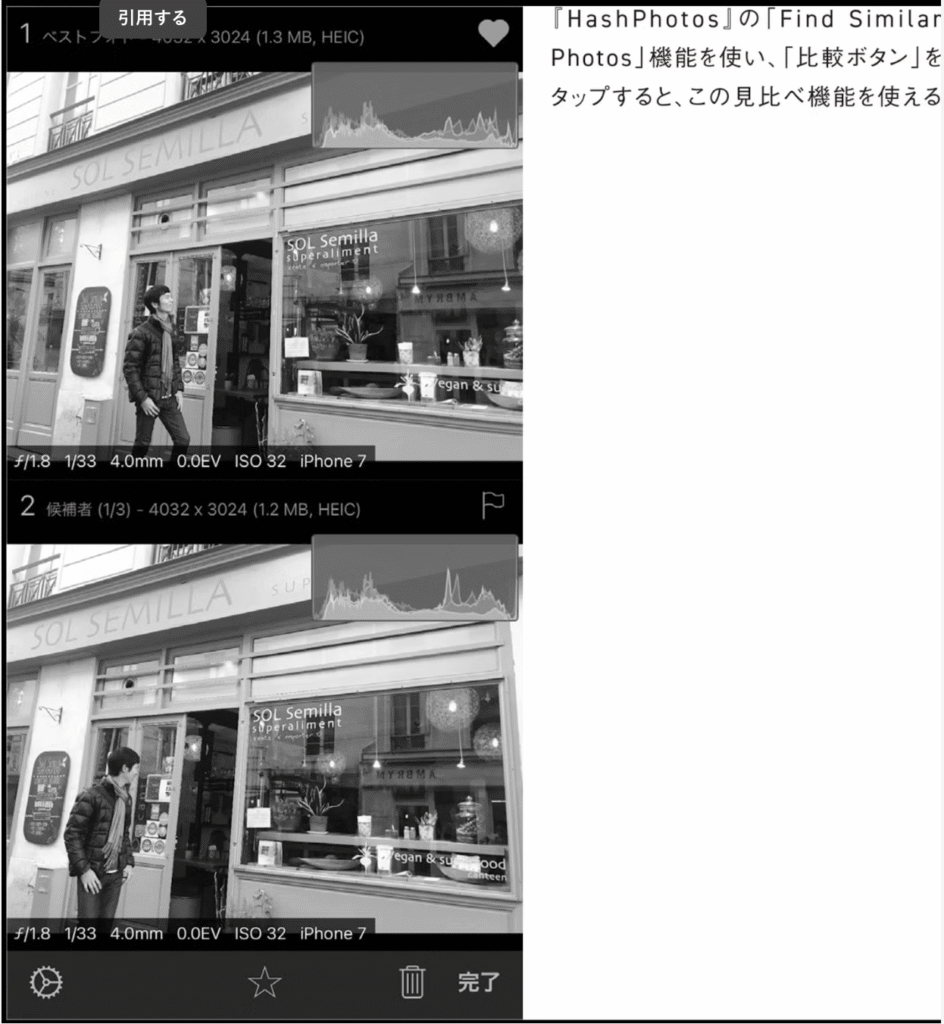 自分で探そうとすると永遠に終わらないが、アプリも苦労する。1つのアプリだと漏れが生じるため、①と②のアプリを併用して悩まず削除できるものを一括処理。・手順3 「判断が難しい類似」 ③に搭載された、類似写真を細かく精査できる「見比べ機能」で一枚ずつ削除していく。
